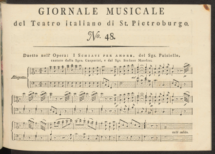 НотыGiornale musicale del Teatro italiano di St. Pietroburgo, o scelta d'arie, duetti, terzetti, overturi, etc. delle opere buffe, rappresentate sul Teatro imperiale de St. Pietroburgo, dati in luce ed acomodati per essere accompagnati d'un cembalo solo da Bernardo Theodoro Breitkopf, dilettante: Ноты. Duetto (Bastiano, Gelinda) nell' opera "I schiavi per amore" : "Piche, cornacchie e nottole..." / del sgr. Paisiello ; cantato dalla sgra. Gasparini, e dal sgr. Stefano MandiniПаизиелло, Джованни (1741-1816), Композитор [1797]Сводное описание: Giornale musicale del Teatro italiano di St. Pietroburgo, o scelta d'arie, duetti, terzetti, overturi, etc. delle opere buffe, rappresentate sul Teatro imperiale de St. Pietroburgo, dati in luce ed acomodati per essere accompagnati d'un cembalo solo da Bernardo Theodoro Breitkopf, dilettante: Ноты : [per canto con accompagnato di cembalo, per cembalo solo]Онлайн доступ:Электронная копия Наличие: