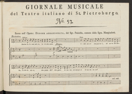 НотыGiornale musicale del Teatro italiano di St. Pietroburgo, o scelta d'arie, duetti, terzetti, overturi, etc. delle opere buffe, rappresentate sul Teatro imperiale de St. Pietroburgo, dati in luce ed acomodati per essere accompagnati d'un cembalo solo da Bernardo Theodoro Breitkopf, dilettante: Ноты. Rondo nell' opera "Didone abbandonata" : "Non ha ragione, ingrato!.." / del sgr. Paisiello ; cantato dalla sgra. ManciurlettiПаизиелло, Джованни (1741-1816), Композитор [1796]Сводное описание: Giornale musicale del Teatro italiano di St. Pietroburgo, o scelta d'arie, duetti, terzetti, overturi, etc. delle opere buffe, rappresentate sul Teatro imperiale de St. Pietroburgo, dati in luce ed acomodati per essere accompagnati d'un cembalo solo da Bernardo Theodoro Breitkopf, dilettante: Ноты : [per canto con accompagnato di cembalo, per cembalo solo]Онлайн доступ:Электронная копия Наличие: