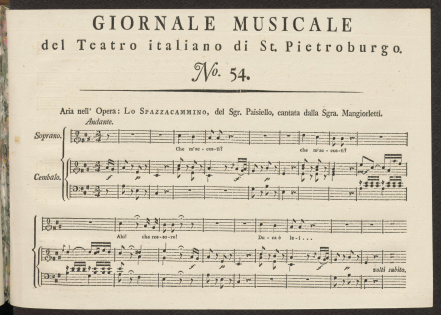 НотыGiornale musicale del Teatro italiano di St. Pietroburgo, o scelta d'arie, duetti, terzetti, overturi, etc. delle opere buffe, rappresentate sul Teatro imperiale de St. Pietroburgo, dati in luce ed acomodati per essere accompagnati d'un cembalo solo da Bernardo Theodoro Breitkopf, dilettante: Ноты. Aria nell' opera "Lo spazzacammino" : "Che m'accosti!.." / del sgr. Paisiello ; cantata dalla sgra. MangiorlettiПаизиелло, Джованни (1741-1816), Композитор [1798]Сводное описание: Giornale musicale del Teatro italiano di St. Pietroburgo, o scelta d'arie, duetti, terzetti, overturi, etc. delle opere buffe, rappresentate sul Teatro imperiale de St. Pietroburgo, dati in luce ed acomodati per essere accompagnati d'un cembalo solo da Bernardo Theodoro Breitkopf, dilettante: Ноты : [per canto con accompagnato di cembalo, per cembalo solo]Онлайн доступ:Электронная копия Наличие:
